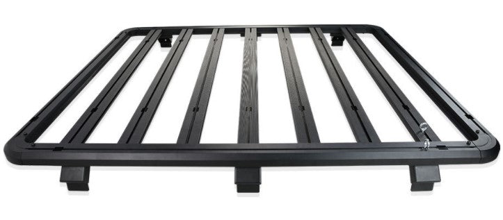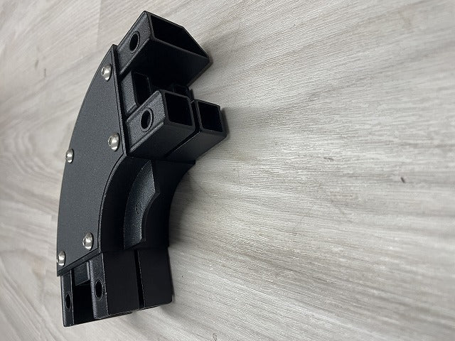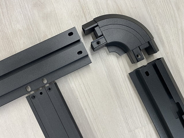 - 横方向のバー材を9本にすることで荷重を分散。(材質:バー材、コーナー部の一部:アルミニウム、その他ブラケット等:スチール材、サイズ158x131cm コーナー部にアルミコネクタを使用して強度を保持、6か所のブラケットを使用し既存のレインガーターを使用しボルトオン装着可能。)